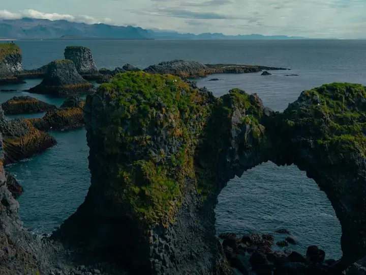 İzlanda kıyılarında, bazalt uçurumlar ve burunlar bu dersi özellikle iyi öğretir çünkü kaya dayanıklıdır ama genellikle iyi eklemlenmiştir. Dyrhólaey civarındaki yığın ve kemer kıyısı, volkanik kayayı ayrılmış formlara dönüştüren deniz erozyonunun gerçek bir örneğidir ve İzlanda kıyıları genel anlamda, dalgaların aynı damarları bulmaya devam ettiğinde neler olduğunu gösterir.