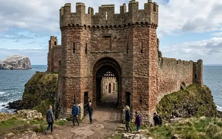 Tantallon Kalesi'nde giriş, kalelerin hareketi nasıl kontrol ettiğini ortaya koyuyor: köprü, eşik ve kemer birlikte hareketi daraltmak, yavaşlatmak ve izlemek için çalışır.