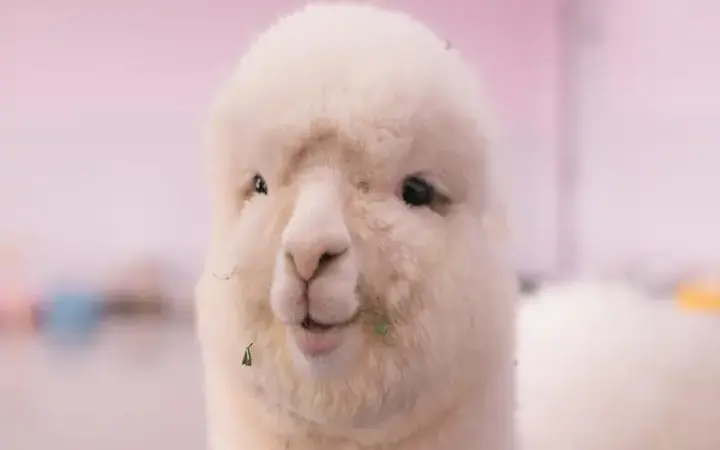 Çitlerle çevrili yeşil bir otlakta bulunan bir alpaka, beklenmedik bir şekilde zarif çıkıyor; solgun yüzü, daha koyu postu ve dik duruşu, ikinci bir bakışta yumuşak, derli toplu ve sessiz bir şıklık hissi yaratıyor.